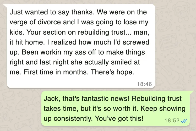 My wife told me she 'wasn't in love with me anymore' and wanted a separation. I was devastated. I stumbled across this guide and the 'reigniting her love' chapter spoke directly to my situation. I realized I'd been neglecting her emotional needs for years. The '5 love language mastery strategies' opened my eyes - Her primary love language was acts of service, and I'd been trying to show love through telling her. I started doing little things around the house without being asked, surprising her with her favorite coffee in the morning, and planning date nights. Last night, she cuddled up to me on the couch - something she hasn't done in months - and whispered 'I feel so much closer to you recently and I don't know why, but I don't want it to change.' I honestly teared up. This guide didn't just save my marriage, it's helping me become a better man and husband.